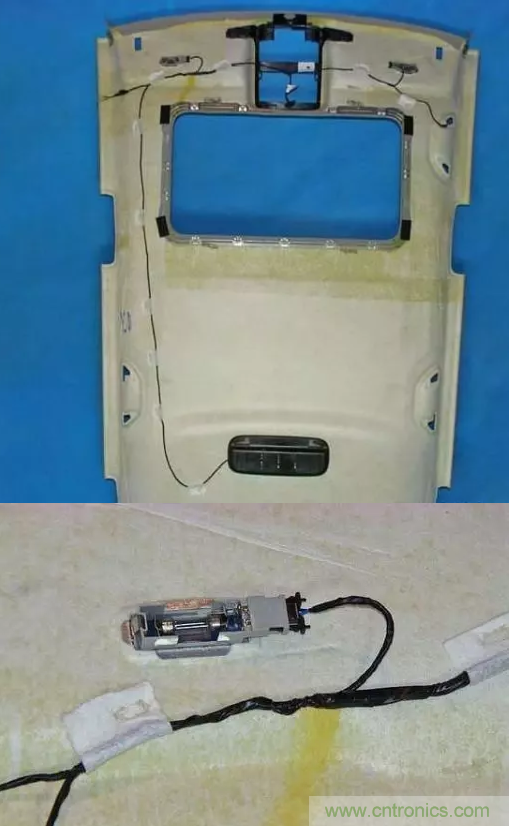 高爾夫的頂棚線束包扎設計方案為膠帶黏粘到頂棚上進行固定,如下圖所示。