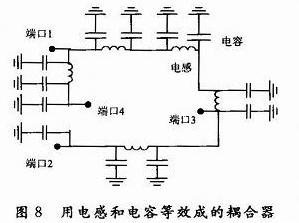 由于第二部分設計的天線傳輸線阻抗是50 Ω,所以1/4傳輸線的阻抗是70.7 Ω,將710 MHz代入,則可以求得L=15.8 nH,C=3.17 pF。這樣,就可以設計出180°的混合耦合器如圖8所示。將耦合器的3,4端口通過通孔連接天線,1,2端口接饋電網絡,就可構成一個雙天線的去耦合系統。