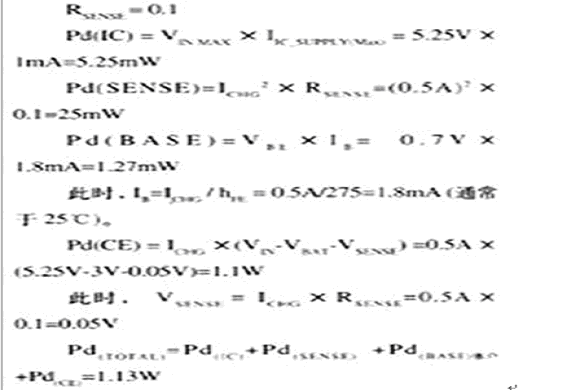 當電池處于預充電壓閾值(VPRE),充電階段進入快速充電-恒流階段,此時將產生最大功率損耗。對于正常工作狀態時出現最高功率損耗的情況,其主要功率損耗區及計算范例如下所示。此應用實例的電池規格為:電池:單室鋰離子500mAh如用于便攜式手持設備(手機、MP3播放器等)