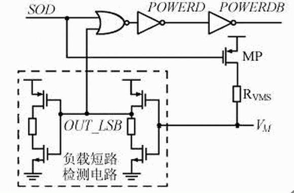 圖4 中SOD為過放電檢測信號,系統處于正常狀態時,SOD為高電平,VM為低電平,因此待機狀態控制信號POWERD輸出高電平、POWERDB輸出低電平。當系統進入過放電狀態時,SOD(延時后的信號)變為低電平,MP導通使VM變為高電平,最終使POWERD變為低電平、POWERDB變為高電平,它們控制保護電路相應模塊停止工作,系統進入待機狀態。當對電池進行充電時,由圖1可知VM被強制拉到低電平,使負載短路檢測電路的輸出信號OUT_LSB變為高電平;此時,不論SOD為何值或非門都將輸出低電平,POWERD由此變為高電平,這樣,就可實現待機狀態的退出。