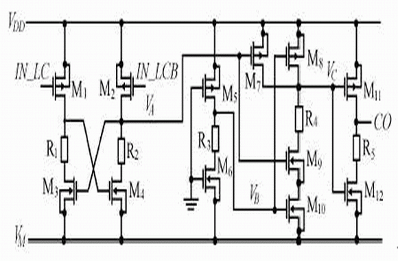 在正常的放電過程中,VM端電位大于零而接近于零,可近似為VSS。此時,該電路的輸入信號IN_LCB=‘0’,IN_LC=‘1’,顯然,CO輸出為高電平(VDD)。