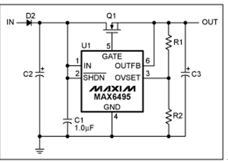 MAX6495–MAX6499/MAX6397/MAX6398過壓保護(OVP)器件用于保護后續電路免受甩負載或瞬間高壓的破壞。器件通過控制外部串聯在電源線上的n溝道MOSFET實現。當電壓超過用戶設置的過壓門限時,拉低MOSFET的柵極,MOSFET關斷,將負載與輸入電源斷開。