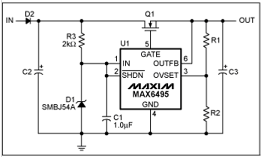 過壓保護(OVP)器件數據資料中提供的典型電路可以滿足大多數應用的需求(圖1)。然而,有些應用需要對基本電路進行適當修改。本文討論了兩種類似應用:增大電路的最大輸入電壓,在過壓情況發生時利用輸出電容存儲能量。