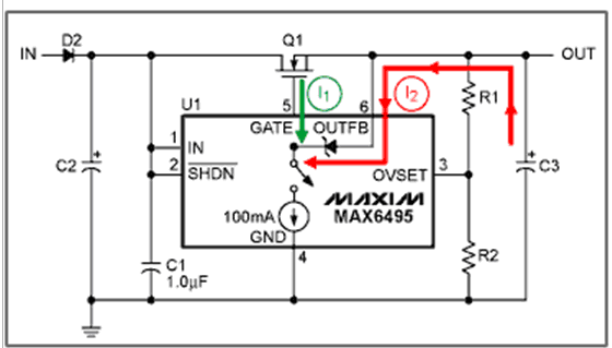 MAX6495–MAX6499/MAX6397/MAX6398通過內部100mA的電流源(見圖4)連接到GATE輸出,以對柵極電容和輸出電容放電。電流源先對GATE放電(電流I1,綠色箭頭),直到GATE的電壓等于OUTFB電壓,然后斷開FET,電流源繼續降低GATE電壓,最后,直到內部的箝位二極管變為正向偏置,對輸出電容放電(電流I2,紅色箭頭)。