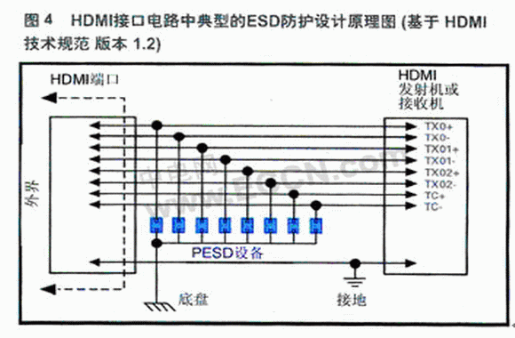 圖4、圖5和圖6展示了利用瑞侃電路保護(hù)部門PESD器件對(duì)HDMI1.3、USB2.0和IEEE1394接口電路進(jìn)行保護(hù)的典型應(yīng)用。這些保護(hù)將ESD與敏感電路隔離。在傳輸線路脈沖(TLP) 測試和IEC61000-4-2測試中,尤其是經(jīng)過多次采樣(1000次TLP測試)后,其性能要比其他可比較的元件好。相對(duì)于其他典型的聚合物ESD防護(hù)器件,這類PESD器件的較低觸發(fā)電壓(通常150V)和低箝位電壓(通常25V)能更好的幫助保護(hù)敏感電子元件。該器件采用電子工業(yè)中最流行的0603和0402貼裝形式,符合RoHS的嚴(yán)格要求;幫助機(jī)頂盒敏感電路、手提電腦、手機(jī)和其它便攜式設(shè)備免ESD侵害。