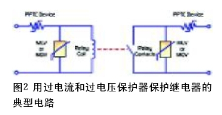 圖2是保護(hù)繼電器的一種典型電路。PPTC保護(hù)器是是與繼電器繞組串聯(lián)著,在出現(xiàn)故障或者發(fā)生意外的過載時(shí),它限制繼電器中流過的電流。這個(gè)圖中,還有一個(gè) PPTC保護(hù)器與繼電器的觸點(diǎn)串聯(lián)著,它起的作用與保護(hù)繼電器繞組是一樣的。在選擇PPTC保護(hù)器時(shí),很重要一點(diǎn)是它的額定電壓要等于或高于預(yù)期的最高電壓。還要求保護(hù)器的保持電流必須等于或大于正常運(yùn)作時(shí)的最大穩(wěn)定狀態(tài)電流。此外,還要考慮到最高環(huán)境溫度,這是因?yàn)殡S著環(huán)境溫度上升,保持電流下降。
