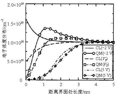 圖1給出了不同的柵壓下考慮多晶硅量子效應時多晶硅中載流子的分布和經典下載流子的分布,圖中CL為經典描述下載流子分布,QM為考慮量子效應下載流子的分布。體原封不動摻雜為1018 cm−3,多晶硅摻雜為1020 cm−3。當所加電壓為負電壓和柵壓為閾值電壓時,量子效應下的載流子分布與經典的情況有很大的差別,而加的正電壓很大時,量子情況與經典情況沒有很明顯的差別。這是由于在外加電壓為負時,能帶的突然變化對電子波函數有顯著影響;而外加電壓為正的時候,對電子波函數影響很小。