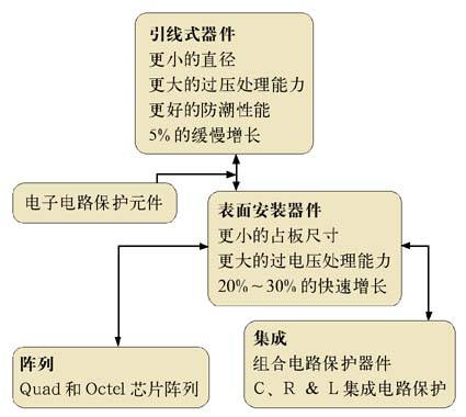 集成也對基于硅的電路保護元件產生了影響。利用更加先進的半導體器件上的硅基層實現電路保護的特性是可能的。例如,在一個集成的被動元件(IPD)中創建一 個除了電容和電阻功能以外的電路保護層。這種IPD的趨勢具有重大的意義,因為許多這樣的器件被安裝在計算機和網絡連接器件的I/O端口上。