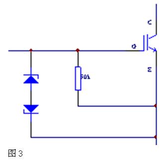 這時若集電極和發射極處于高壓狀態時,會使IGBT發熱,極易引起IGBT損壞。為防止此類情況發生,可在IGBT的柵極與發射極間并接一只50~100歐姆的電阻,此電阻應盡量靠近柵極與發身極。如圖3所示。