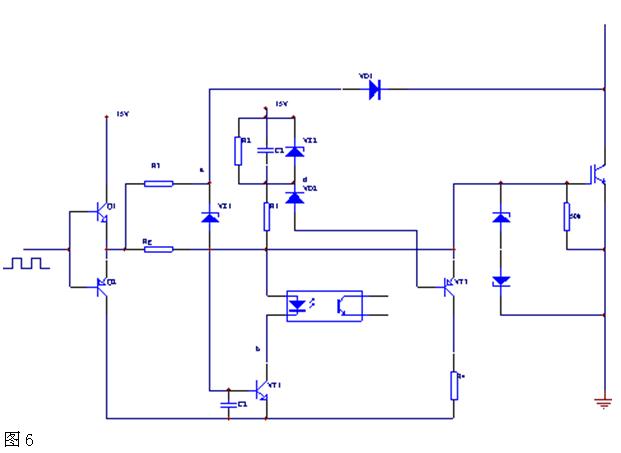 應設計保護電路為立即保護型。即保護電路動作后,切斷供電電源,停止逆變電源工作;最后,對元器件并沒有失效,而是由于某種其它原因如負載突然加大造成的過流,可嘗試采用一種慢降柵壓的電路來實現如圖6:
