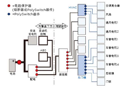 由于PolySwitch器件的采用不再需要經過便于用戶接近的中央熔斷器座進行配電布線,因此可以按照電源與負載之間最直接的路徑完成布線。從而縮短了電線長度,減小了電線規格,不僅節省了大量空間、尺寸和成本,也減少了車輛中使用的各種端子、觸點、開關和電子驅動電路。此外,分散式架構還可以減少所需的連接器和接線箱數量及尺寸。比如,通過在車門模塊中采用PolySwitch器件,可以使用一條電力饋線,節省了電線,降低了成本和接線箱尺寸。
