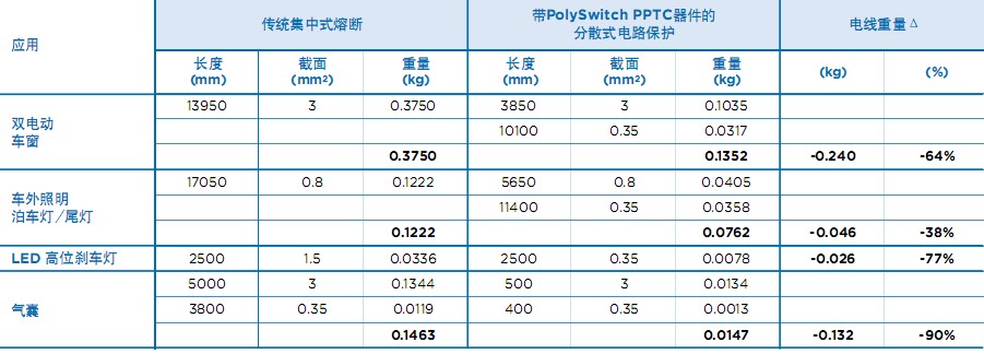 一項針對中、高檔乘用車、采用分散式架構和泰科電子PolySwitch器件的研究顯示,僅銅線一項就節省重量約50%。此外,由于采用了分散式架構,并用可復位PolySwitch器件替代熔斷器,系統可靠性和設計靈活性得到大大改善。