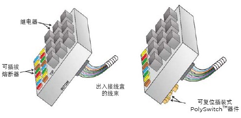 使用不需要司機維護的可復位電路保護器件為設計人員提供了大量可單獨使用也可組合使用的解決方案。位于儀表面板中的單一接線箱可能仍然要使用。與熔斷器不同的是,為便于更換,熔斷器必須安裝在接線箱上部,而PPTC器件可以嵌入接線箱內或安裝在接線箱的其他表面上,從而減少了正面的面積需求,如圖3所示。