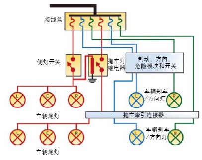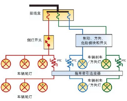 除此以外,連接各車燈到交匯節點的導線只需承載流向此車燈的電流——而采用共用饋線及其熔斷器的設計就必須承載流向所有車燈的電流總和。最重要的一點是,無論哪個拖車牽引燈電路發生過流故障,受影響的只有這個電路,其他車燈將正常工作。