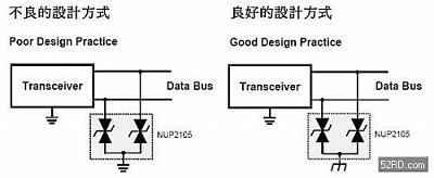 (圖一) TVS二極管的箝位效能可以透過將元件安排在接近輸出入連接點,并將連接TVS的走線長度縮短而提高。