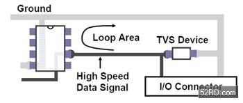 幅射噪音與受射頻信號影響的問題可以透過盡可能縮減由高速資料與接地線所形成的迴路區(qū)大小來降低,一個解決迴路區(qū)最小化問題的有效方法是在印刷電路板設(shè)計上加入接地面,特別是在走線長度相對較長時,雖然將TVS元件與晶片間的距離盡量加大可以提供隔離,但卻可能增加回路區(qū)的面積大小,請參考(圖三)。