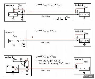 突崩式TVS二極管雖然擁有高突波規(guī)格,但相對較大的電容值使得這類元件成為負載切換開關(guān)與直流電源匯流排保護應(yīng)用的較佳選擇,相反地,二極管陣列適當?shù)耐徊ㄒ?guī)格與較小的電容值則較適用于高速資料連接線的保護,突崩式TVS與二極管陣列通常可以交互使用,但部份電路在選擇適合採用的元件時則需要經(jīng)過仔細的分析。(圖四)描述了當存在一個電流可以透過資料線流經(jīng)二極管陣列路徑時所發(fā)生的向后驅(qū)動問題,如果VDD2大于VDD1,那么資料連接線有可能意外地提供電源給模組1,這個情況可能會造成邏輯晶片的電源啟動問題,或是在斷電后模組1上指示燈被點亮的異常狀況。