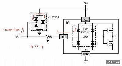 理想的外加TVS元件應(yīng)該能夠吸收所有突波脈沖的能量,但是在實際上則不然,部分的突波電流能量可能會通過晶片內(nèi)部的保護電路,一個限制電流流入內(nèi)部保護電路的方法是使用一顆串接電阻,如(圖六)。雖然內(nèi)部保護電路在避免組裝時發(fā)生ESD失效的表現(xiàn)上相當良好,但保護元件相對較小的尺寸則限制了它們承受正常產(chǎn)品使用情狀下所發(fā)生突波信號的能力,另一方面,雖然二極管的突波處理能力與體積成正比,但通常在晶片中整合較大型的保護元件并不實際。