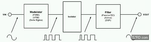舉例來說,典型音頻系統的DSP必須從光碟讀取數字內容,然后處理這些資訊以便加入適當音效(2、4或8聲道音頻),最后再將處理完成的位元串流送到音頻數字模擬轉換器(圖1的濾波器/解調器)。數字模擬轉換器輸出的模擬信號接著會送到揚聲器,重新產生使用者想聽的聲音。如前所述,許多音頻系統(尤其是24位元高傳真系統)喜歡將DSP電路的接地面與電源(揚聲器)接地面隔離。這項技術是用來將接地回路的拾取信號減至最少,進而降低背景噪音和嗡嗡聲。
