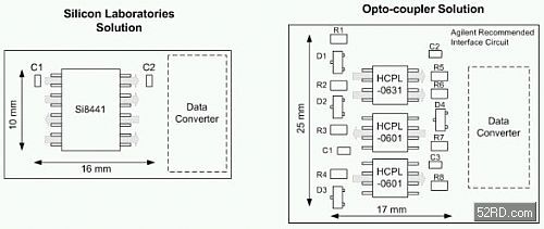 射頻耦合器的暫態耐受性超過30kV/μs,光耦合器只有10kv/μs。它們還提供2500VRMS的電氣隔離能力。射頻耦合器的制程參數比較不容易受到制程效應影響,故對溫度變動的抵抗能力也優于光耦合器,許多射頻耦合器的操作溫度最高都能達到125℃。相較于光耦合器,射頻耦合器的最大優點在于體積更精巧。它們通常使用每個通道僅需很小晶粒面積的方式制造,許多產品甚至還採用SOIC封裝技術,這使得每個封裝都能提供多個通道。射頻耦合器的缺點是操作范圍相當有限,這使它們在高電壓產品的應用受到極大限制。射頻耦合器通常只能使用5V電壓操作。圖5顯示數字隔離元件對于電路板面積的影響。