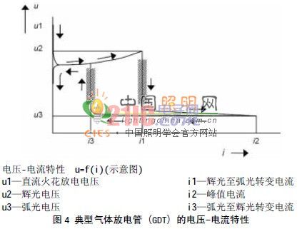 由于浪涌干擾所致,一旦加在氣體放電管兩端的電壓超過火花放電電壓(圖4的u1)時(shí),放電管內(nèi)部氣體被電離,放電管開始放電。放電管端的壓降迅速下降至輝光放電電壓(圖4的u2)(u2在表2中的數(shù)值為140V或180V,與管子本身的特性有關(guān)),管內(nèi)電流開始升高。隨著放電電流的進(jìn)一步增大,放電管便進(jìn)入弧光放電狀態(tài)。在這種狀態(tài)下,管子兩端電壓(弧光電壓)跌得很低(圖4的u3)(u3在表2中數(shù)值為15V或20V,與管子本身的特性有關(guān)),且弧光電壓在相當(dāng)寬的電流變動(dòng)范圍(從圖4的i1→i2過程中)內(nèi)保持穩(wěn)定。因此,外界的高電壓浪涌干擾,由于氣體放電管的放電作用,被化解成了低電壓和大電流的受保護(hù)情況(u3和i2),且這個(gè)電流(從圖4的i2→i3)經(jīng)由氣體放電管本身流回到干擾源里,免除了干擾對(duì)燈具可能帶來的危害。隨著浪涌過電壓的消退,流過氣體放電管的電流降到維持弧光放電狀態(tài)所需的最小值以下(約為10mA~100mA,與管子本身的特性關(guān)),弧光放電便停止,并再次通過輝光放電狀態(tài)后,結(jié)束整個(gè)放電狀態(tài)(熄弧)。