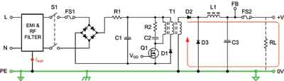 本地電路直流接地與電源接地參考電壓間的鏈路通常由負(fù)責(zé)將線路電壓轉(zhuǎn)換成所需直流輸出的電源提供。圖1顯示了一款低成本開關(guān)模式電源的簡化結(jié)構(gòu)圖,該開關(guān)模式電源通常用于個(gè)人電腦、激光打印機(jī)和其他設(shè)備。SMPS輸出的直流接地通過SMPSChassis以電源的保護(hù)性接地(PE)導(dǎo)線為參考。因此,該直接鏈路起了一個(gè)感應(yīng)導(dǎo)線的作用,從而將PE電壓變成了本地直流接地電壓。