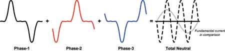 所有中性導(dǎo)線都并入配電板中的一個(gè)大直徑中性導(dǎo)線,就像一個(gè)變壓器一樣(見圖5)。在線性負(fù)載情況下,多相位系統(tǒng)的中性電流在一定程度上相互抵消。由于負(fù)載不平衡(見圖3),只有總中性電流的一小部分保留了下來。