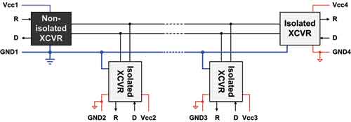 圖8顯示了兩個(gè)遠(yuǎn)程收發(fā)器節(jié)點(diǎn)的詳細(xì)連接,而圖9則顯示了一個(gè)使用了多個(gè)收發(fā)器的隔離式數(shù)據(jù)傳輸系統(tǒng)的例子。除1個(gè)收發(fā)器以外,所有其他的收發(fā)器均通過隔離連接至總線。左側(cè)的非隔離收發(fā)器為整個(gè)總線提供了單接地參考。