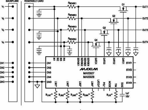 Maxim公司推出了一系列電源熱插拔控制器,適應(yīng)于各種背板電源的要求。MAX5927/5929是針對(duì)低壓電源系統(tǒng)的+1V到13.2V的四通道熱插拔控制器。在電路板熱插拔時(shí),MAX5927/5929控制輸出電壓緩慢升高,同時(shí)限制輸入電流小于預(yù)設(shè)值,避免瞬態(tài)大電流沖擊,保證了系統(tǒng)的安全性和穩(wěn)定性。圖1是典型應(yīng)用電路圖,圖2是熱插拔時(shí)的啟動(dòng)電壓、電流波形。可以看出,MOSFET的柵極電壓受MAX5927/5929的控制,按照固定斜率上升,逐漸打開(kāi)MOSFET,輸出到電路板的電壓也基本同步地按斜率上升,瞬態(tài)電流則始終被控制在門(mén)限值以?xún)?nèi),避免了大的沖擊電流的出現(xiàn)。啟動(dòng)時(shí)間和電流限值都可以簡(jiǎn)單地通過(guò)一個(gè)外部電阻來(lái)設(shè)定,為設(shè)計(jì)工程師提供了極大的靈活性。