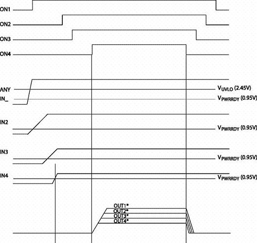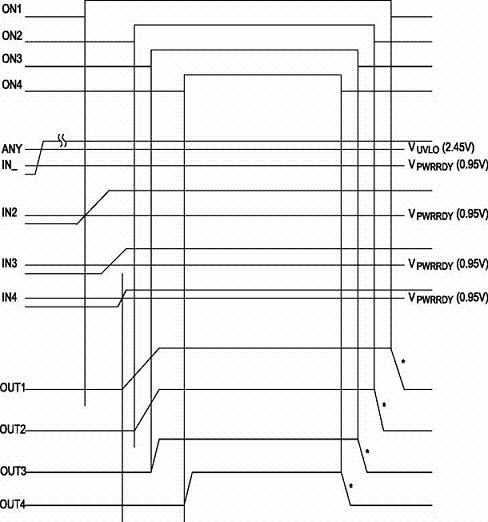 順序上電模式則根據(jù)設(shè)計(jì)者的要求,順序打開(kāi)/關(guān)閉每一個(gè)通道。如果出現(xiàn)故障情況,則所有通道會(huì)被同時(shí)關(guān)閉,圖4是順序上電模式時(shí)序圖。