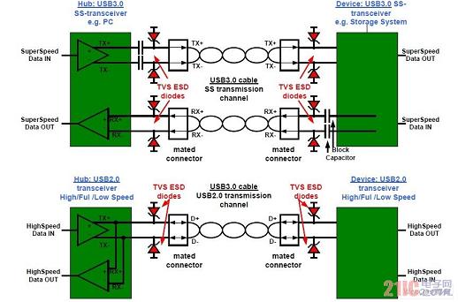 圖1USB3.0物理鏈路在主機側和設備側帶有ESD防護。