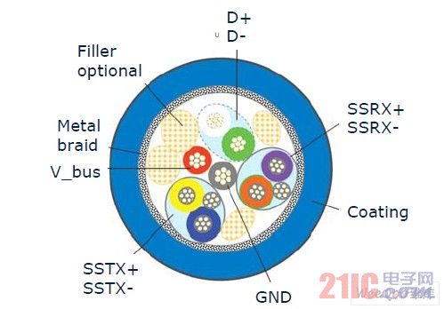 為同時支持USB2.0功能和新的超高速模式,電纜必須采用新的結構,以提供三條差分耦合信號線(TX+/Tx-、RX+/Rx-和D+/D-)。此外,USB3.0電纜還必須具備Vcc線和GND線。這種低成本的USB3.0電纜所面臨的挑戰,是需支持很高的截止頻率且不會在相鄰的差分耦合線對之間形成干擾(圖2a)。