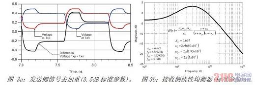 這些寄生電容存在于USB3.0收發器內部和/或PCB外部。不匹配的PCB線路、USB3.0連接器或其它并聯電容器等,均會造成外部寄生電容。因此,這些額外的并聯電容器必須盡可能小。還必須考慮到USB3.0電纜的低通頻率響應(圖2b)。為抵消高頻內容的衰減,可在發送側和接收側利用專用均衡器改變信號。這些措施均有助于加快信號上升和下降邊的速度,從而得到張得更開的眼圖(即更高的信號完整性)(見圖3a和圖3b)。