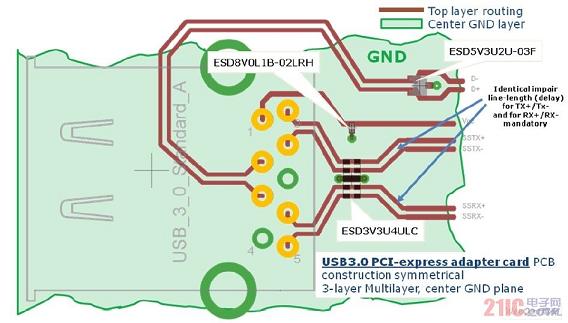(5)差分耦合鏈路的正電和負電線路(包括USB3.0電纜)之間的延遲(線路長度)完全相同(最大限度地減少斜率下降)。對于保持很高的信號完整性和避免生成共模信號,這一點很重要。[page]