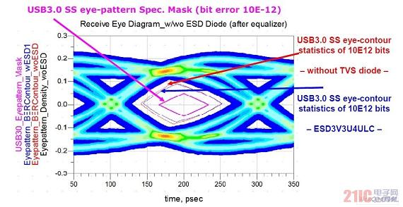 模擬所用誤碼率為1E6。根據模擬結果,推導出誤碼率為1E12時的眼圖張開程度(紅色和藍色輪廓線)。分別在未帶TVS二極管(紅色輪廓線)和帶有TVS二極管(ESD3V3U4ULC,藍色輪廓線)的情況下,計算出眼圖的張開程度(圖7)。在主機側和設備側帶和未帶ESD3V3U4ULC時的眼圖圖7:在主機側和設備側帶和未帶ESD3V3U4ULC時的眼圖。在主機側和設備側帶有超低電容TVS二極管ESD3V3U4ULC,眼圖張開程度(輪廓線)會受到一定影響。雖然眼圖張開程度會略微減小,但相比于USB3.0技術規范中規定的基準模式(紅紫色輪廓線),仍大出許多。