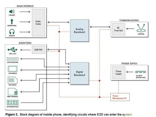 由于手機的設計對象是大眾消費者,而且可在任何環境中使用,因此ESD很有可能會進入其中的一個端口或I/O接口,并導致芯片組出現電氣不穩定現象或完全損壞。圖2用于幫助說明不同電路該用什么樣的ESD保護技術。它表明,所有的電路都有可能為ESD進入手機提供一個途徑。