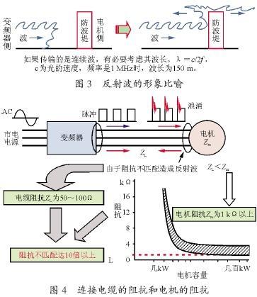 當電機阻抗很大時,反射波與入射波正向疊加,即ZL<ZM時,反射系數=1。而且,生成與逆變器的輸出脈沖同一極性、幾乎同一大小的反射波,疊加后成為微浪涌尖峰電壓。圖3 形象地表示了反射的情況,微浪涌電壓就像海浪遇到障礙一樣被抬得很高。圖4 表示實際電纜和電機的阻抗差別,一般電機的阻抗是電纜特性阻抗的10 倍以上,所以反射總是存在。