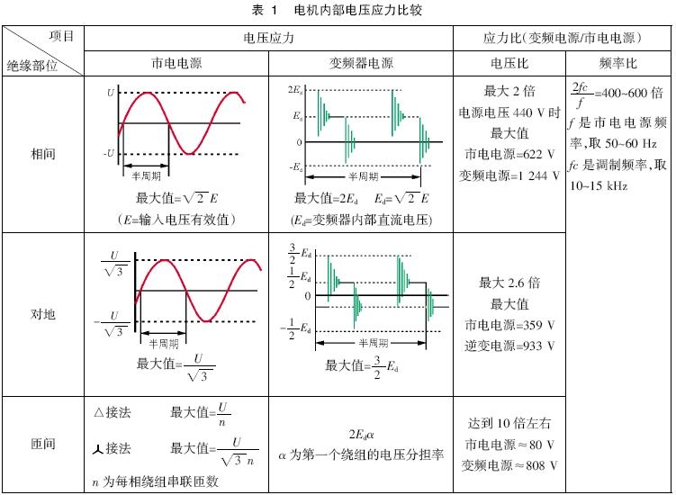 電機內部的斷面如圖7 所示。電機有定子和轉子,定子內有安放三相線圈的槽。如果放大槽的內部,可以看到有許多的線圈(漆包線),各線圈對地之間、各相之間、線匝相互之間都有絕緣存在。通常對地、相間都有絕緣紙插入,而線匝之間沒有絕緣紙插入,它利用堅固的漆包線的漆層獲得絕緣。微浪涌電壓給這些絕緣全部帶來影響,這些絕緣損壞之中,線圈匝間損壞最多。表1 列出了有關電機內部各絕緣部分承受的電壓值,也稱為電壓應力,提供了用市電電源驅動電機和用變頻器驅動時相比較的資料。