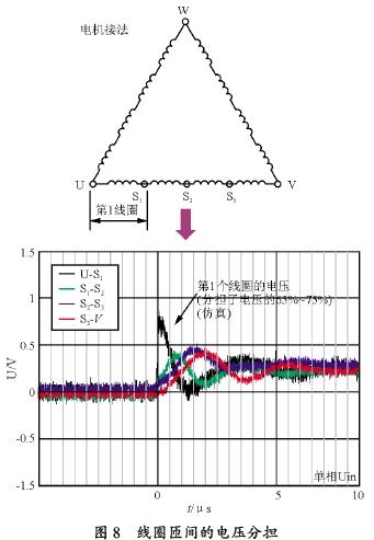 浪涌電壓滲入電機內部的時候,線圈匝間究竟加上多少電壓,模擬結果如圖8所示。該模擬是將測量點放在電機的每一線圈上(電機槽內的漆包線圈上),在U-V之間加上上升時間0.14 滋s 的浪涌電壓的測量的結果。U-S1之間是第1 線圈分擔的電壓,測得它分擔了全電壓65豫耀75%,而別的線圈S1-S2、S2-S3、S3-V 之間分擔了10豫耀20%,這是因為電機內部的阻抗大,微浪涌電壓在逐漸衰減。