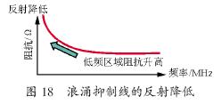 浪涌抑制線的反射降低:浪涌電流的高頻分量在浪涌抑制線內被旁路和衰減,使浪涌形狀變鈍,浪涌頻帶中心向低頻方向移動。又從浪涌電流來看,好像浪涌抑制線的特性阻抗逐漸變高了,使得抑制線末端不易被反射回來。如圖18所示。