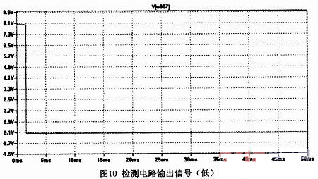 整流濾波后的信號V2,輸入到比較器IC4的正信號端,與IC4的負端電壓(V3=Vcc/2=4V))進行比較。當信號電平值大于4V時,比較器輸出高電平(V4接近運放的電源8V),當信號電平值小于4V時,比較器輸出低電平(V4接近0V),該兩個電平將控制后級檢測電路。圖8為AUX輸入信號后經比較器輸出高電平的仿真輸出,圖9為濾波和比較器的仿真輸出信號。