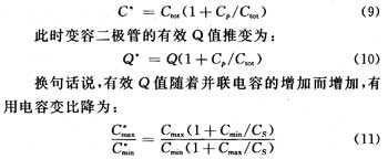 圖1到圖2所示的并聯電容Cp總是存在的。因為電感線圈匝間電容是不可避免的,每個電感均有其自電容,把這個自電容等效為并聯的電容Cp,且認為是無耗的,則總的調諧電容值升高。如果CS足夠大,可以忽略他的影響,則得到有效調諧電容為: