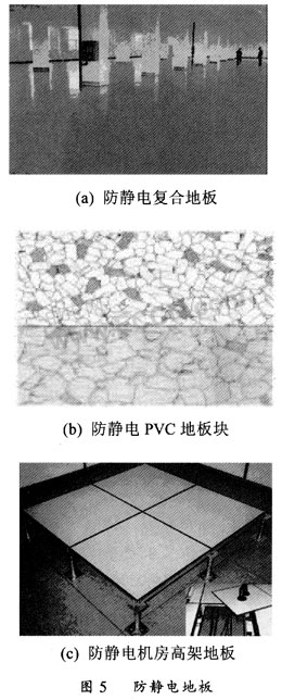 (4)防靜電地板:防靜電地板也有多種,按時效性分,有永久性和臨時性;按材料分有導電橡膠、PVC、導電陶瓷等;按鋪設(shè)方式分,有地面直接鋪設(shè)的和架空的活動地板。可根據(jù)實際需要和成本決定。如需要在地面走多種電纜、管道的環(huán)境如計算機房選擇架空鋪設(shè)的活動地板比較好。圖5是一些防靜電地板。