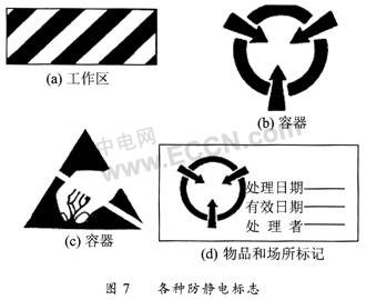(2)張貼醒目的靜電敏感器件標志,圖7是各種防靜電標志。其中(a)是防靜電工作區(qū)的標志,(b)和(c)是防靜電容器、元件架、運輸車等器材上的標記;(d)是經(jīng)防靜電處理的物品和場所的標記;