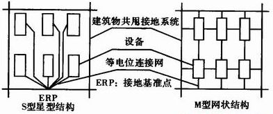 (4)等電位保護。電子設備的機柜機架、金屬外殼、金屬管槽、屏蔽線纜外層、信息設備的防靜電接地端、安全保護接地端、浪涌保護接地端等,在同等電位連接網(wǎng)絡的接地端子相連接時,均需采用最短的距離。控制系統(tǒng)的等電位連接,通常分為“S型星型結構”以及“M型網(wǎng)狀結構兩種”,其中在控制系統(tǒng)中設備較少或者進行局部控制時通常采用S型星型結構,而在相對較大的控制系統(tǒng)中則采用M型的網(wǎng)狀結構。等電位連接的基本方式如圖3所示。