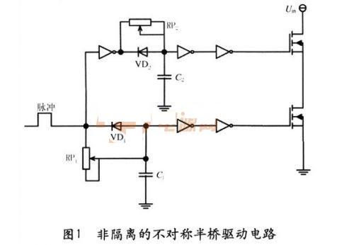 圖1為常用的小功率驅(qū)動電路,簡單可靠成本低,適用于不要求隔離的小功率開關(guān)設(shè)備。其中一路直接接到下管,另外一路經(jīng)反向器反向后驅(qū)動上管。RP1,RP2用于調(diào)節(jié)死區(qū)時間。