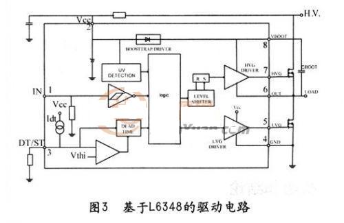 ST公司的L6384是專門的不對稱半橋驅(qū)動芯片,其原理圖及外圍電路如圖3所示。單脈沖從1腳(IN)輸入,5腳(HVG)和7腳(LVG)輸出互補的脈沖。3腳(DT/ST)外接電阻和電容來控制兩路輸出的死區(qū)時間。當(dāng)3腳的電平低于0.5V的時候,芯片停止工作。專用芯片具有外圍電路簡單、占用空間小的特點,但由于其成本較高,不適用于低成本設(shè)計的產(chǎn)品