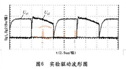 本文設(shè)計了一臺不對稱半橋變換器樣機:工作頻率為98kHz,輸人電壓為400VDC,輸出電壓為30VDC。測得占空比為0.47時的驅(qū)動波形Ug1,Ug1如圖(6)所示。