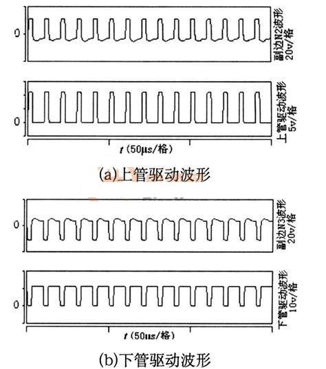 在SABER仿真下,該變壓器副邊N2,N3以及上、下管的驅(qū)動波形分別如圖5(a)、(b)所示。