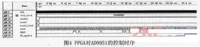 在本系統中,我們基于直接數字頻率合成(DDS)技術進行信號產生。DDS的實現,使用芯片AD9951。AD9951是一個可控的頻率合成芯片,具有32位頻率轉換字,最大合成頻率為160MHz。系統中采用兩塊AD9951,分別產生主振信號和本振信號。FPGA通過該芯片的控制端口,對其產生的信號頻率進行控制。其控制時序如圖4所示。